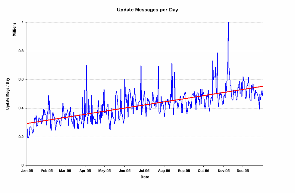 Date BGP Table Size Daily Prefix Updates Daily Prefix Withdrawals End 2005 176,000 700,000 400,000 End 2008 275,000 1,700,000 900,000 End 2010 370,000 2,800,000 1,600,000