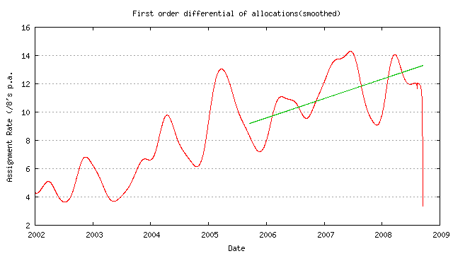 As of August 2008 there are some 39 /8 address blocks left in IANA's unallocated address pool. A predictive exercise has been undertaken using a statistical modelling of historical address consumption rates, using data gathered from the Regional Internet Registries' (RIRs') records of address allocations, and the time series of the total span of address space announced in the internet's inter-domain default-free routing table as basic inputs to the model. The predictive technique is based on a least squares best fit of a linear function applied to the first order differential of a smoothed copy of the address consumption data series, as applied to the most recent 1,000 days' data (Figure 2).