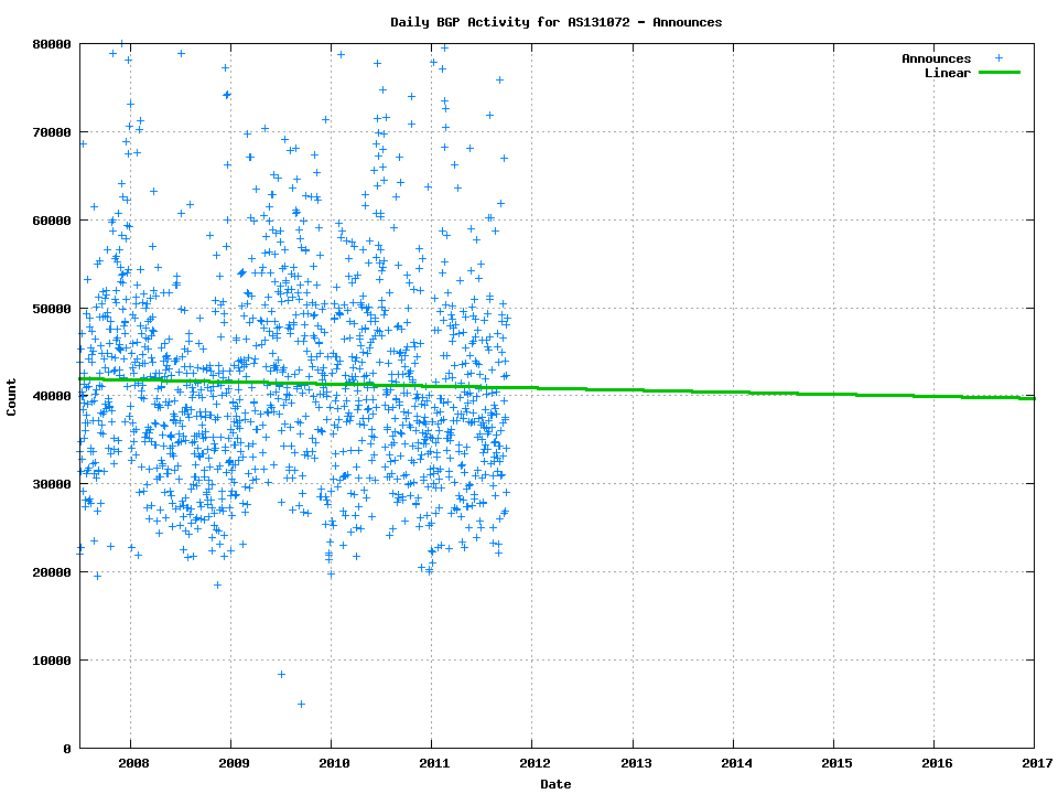 In attempting to address these questions I have used a data set that includes every BGP update over a period of several years at AS 131072. Before examining the data I should note the circumstances this AS. It lies at the edge of the network, and does not provide transit to any other network. Secondly, it is a single LAN, so there is no internal routing protocol, nor any iBGP within the network. Thirdly, the data collected and analyzed here relates to a single eBGP session. So what we are examining here is a pretty typical edge network's eBGP feed that has been stable over an extended period of time.