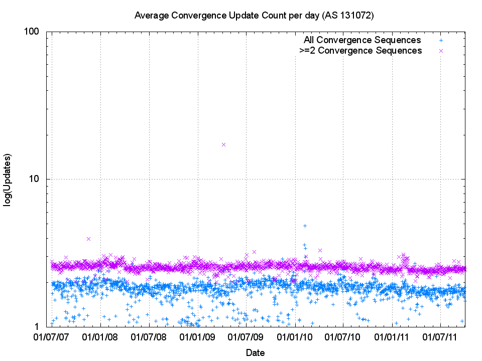 One way of looking at this is to look at the average number of BGP updates required to reach a converged, or stable, routing state, and the average amount of time taken for routing to reach convergence. Here a "convergence event" is defined as a sequence of 1 or more updates for the same prefix separated by no more that 135 seconds, and "stability" is defined as no further updates for 135 seconds or longer.