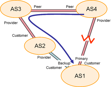 If the AS1 AS4 path is broken, AS4 will withdraw its advertisement of AS1's routes toAS3, who, in turn will send a withdrawal to AS2. As2, will then select the backup path to AS1. AS2 will advertise this path to AS3, and AS3 will advertise this path to AS4. Again, this is part of the intended operation of the primary / backup policy setting. (Figure 3)