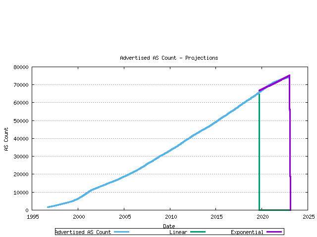 The third view is that of projection of the advertised AS count. The assumption underlying this projection is that all the unadvertised ASs would ultimately be used in the advertised BGP table. Again linear and exponential models are used in the projections.