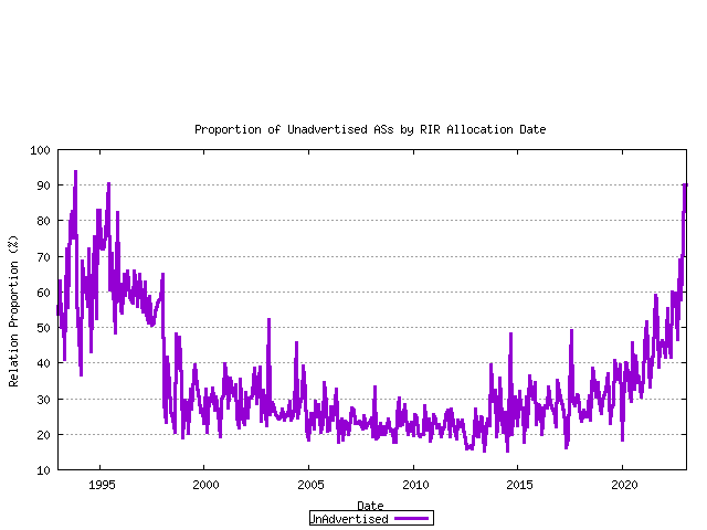 Taking the current set of assigned AS numbers, the set of advertised and unadvertised AS numbers can be matched against the RIR date of assignment. This is shown below.