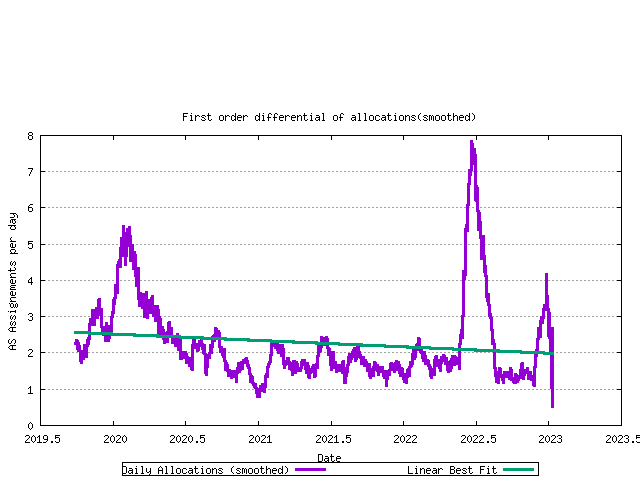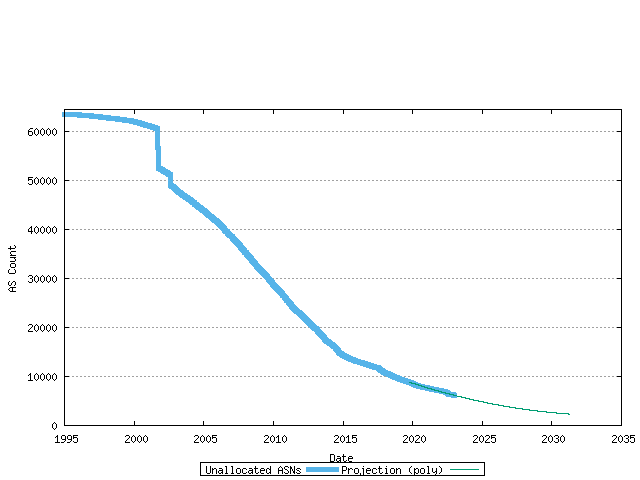 Using a model of each RIR's relative rate of allocation, it is possible to generate a model of 16-bit AS number consumption. Here the end point is the date where the first RIR has exhausted its available pool of 16-bit AS numbers, and no further numbers are available in the IANA unallocated pool to replenish the RIR's pool. The data available suggests a best fit predictive model where this will occur on 09-Jan-2023.