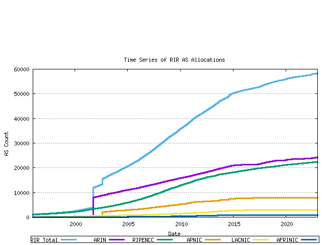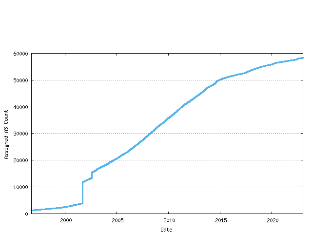 RIRs perform assignments of AS numbers to ISPs and end user entities. The cumulative number of assigned AS numbers over time is shown in the following figure.