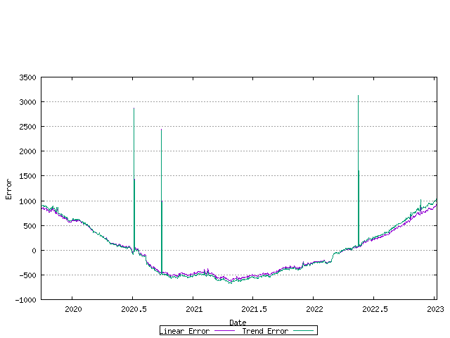 The error between the original data series and the linear and exponential trend models is shown below. The closer the values in these series are to zero, the better the fit.