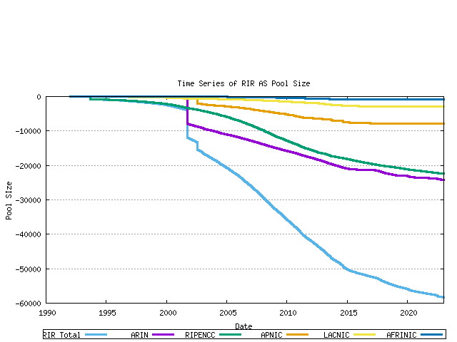 Each RIR allocates from its IANA-Allocated number pool. When the pool reaches a low threshold amount a further 1024 AS number block is allocated by IANA to the RIR. The pool size within each RIR can be derived from the allocation and assignment series data, producing the following graph. The total RIR pool size current is in the range of 4,000 to 7,000 AS numbers across the RIR system.