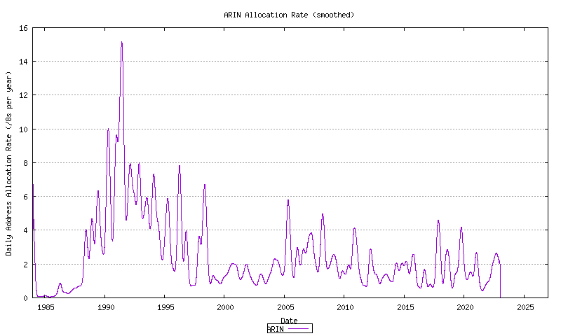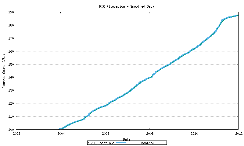 The RIR allocation data is indicated in Figure 19. This data is shown in both its original format, and in a smoothed format, using a sliding window smoothing algorithm, in a double pass of the smoothing algorithm across the data.